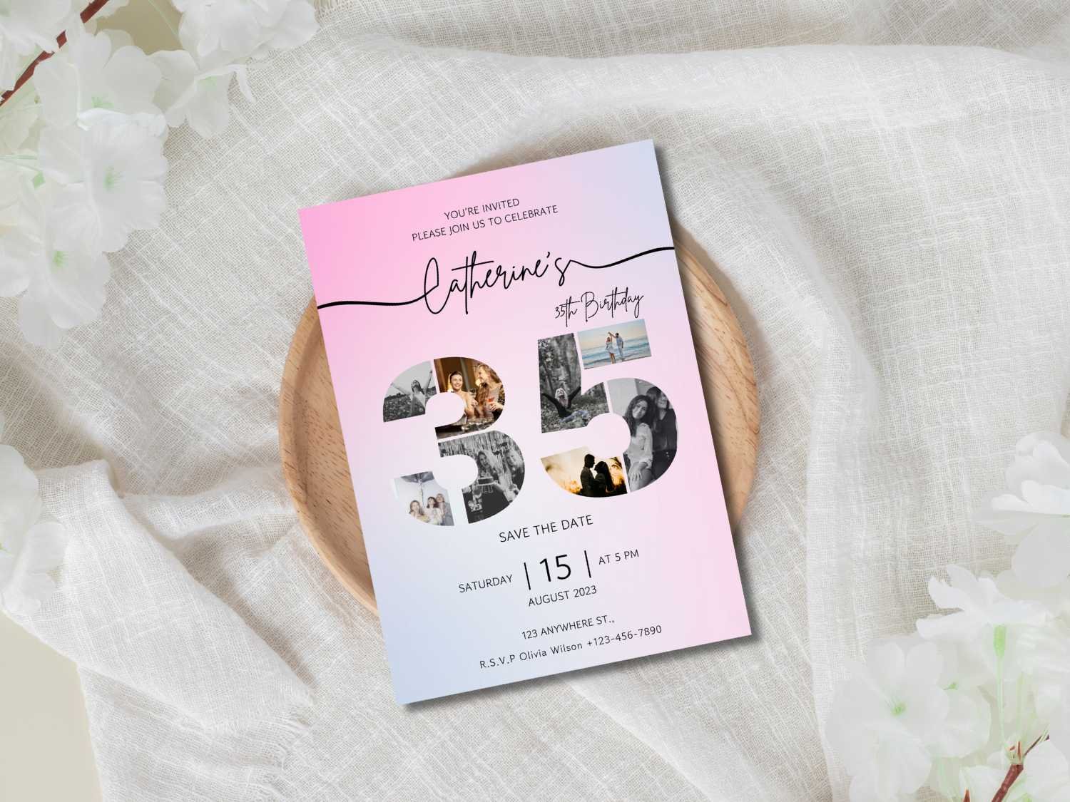 This beautifully designed template features a striking photo collage inside the number “35,” available in two elegant backgrounds: a soft blush gradient or a crisp white. Perfect for a brunch, dinner or cocktail party, this invitation is fully editable and delivered as a digital download—no waiting, no shipping, no fuss!